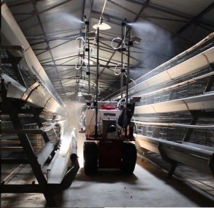 为了提高畜禽养殖防疫消毒作业效率和安全性,研发了畜禽舍自动防疫消毒机器人,其具备自动导航、消毒液精准喷洒、远程视频监测、智能控制等功能,可实现养殖舍内无人化消毒喷雾,其支持PC机和智能手机终端的远程监控。消毒机器人具有全自主和遥控两种作业模式。用户通过控制终端设置喷洒时间、剂量和作业范围,形成机器人防疫消毒作业计划,机器人按照消毒时间自动启动。此外,用户也可以通过PC机或手机终端,对不同作业区域的消毒剂量和喷雾距离进行动态调节。