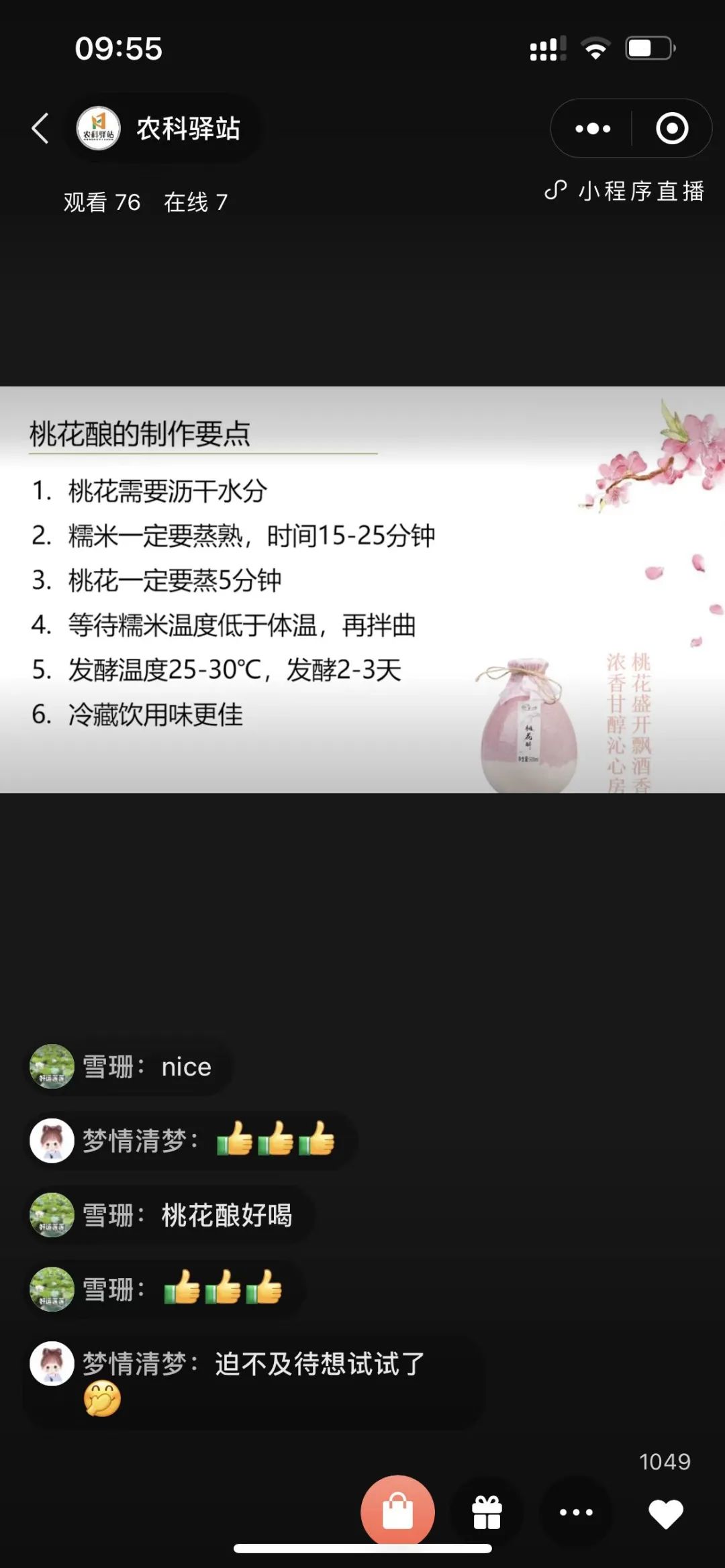 张老师讲解平谷特色大桃的储藏加工及高值化应用,教授桃花酿的制作流程及要点,提高桃产品附加值,延长产业链条。线上反响热烈。
